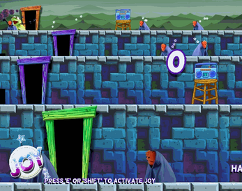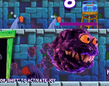 Help stop The Sadness Monster from spreading sadness by spreading joy! Dance in front of a boombox to charge up your Joy Meter. When your Joy Meter is fully charged activate your Joy Ability by pressing E or Shift. Run past as many villagers as you can to make them happy! You only have 10 seconds before you need to charge your Joy Meter again. Try to make everyone happy before the countdown ends. (Hint: Is there someone else besides the villagers you can make happy?)